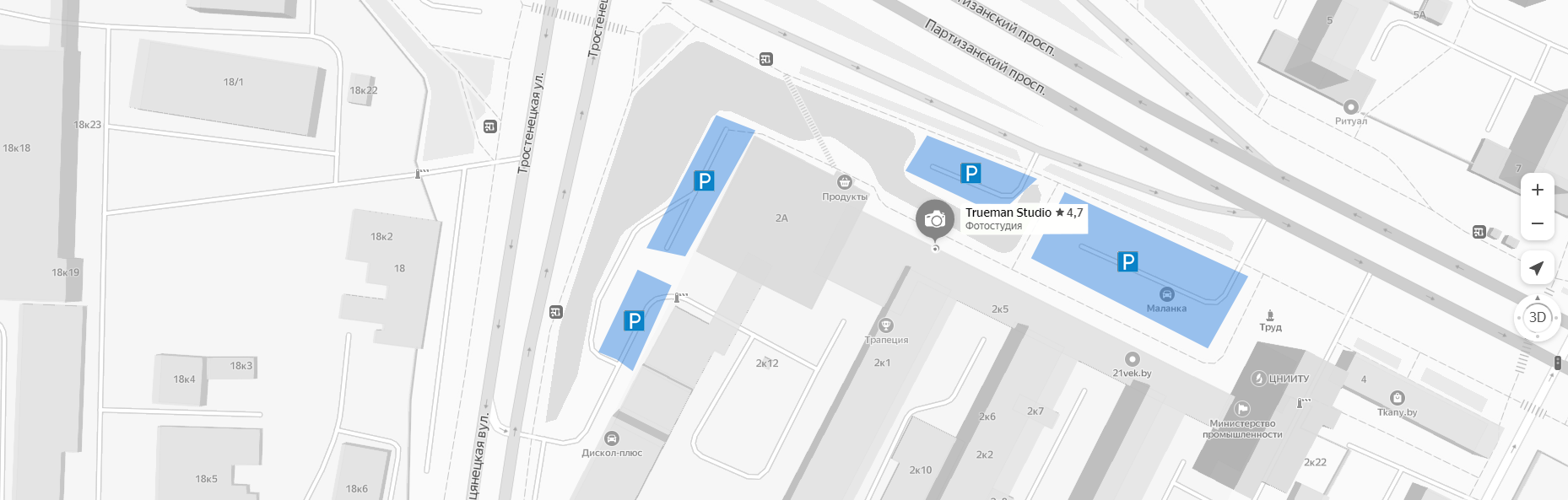 Вокруг здания есть бесплатные парковки. Для навигатора используйте запрос "Trueman Studio"