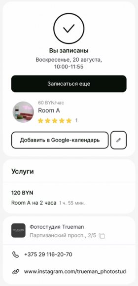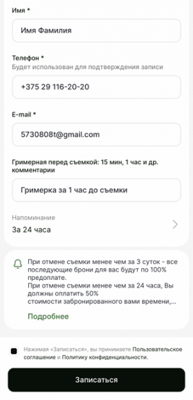В СМС и email подтверждениях будет ссылка по которой вы можете изменить или отменить вашу бронь (но не позднее 48 часов до съемки). В других случаях свяжитесь с нами в instagram или по телефону для отмены/изменения брони. Просим отменять бронь заранее. Обязательно ознакомьтесь с правилами отмены.